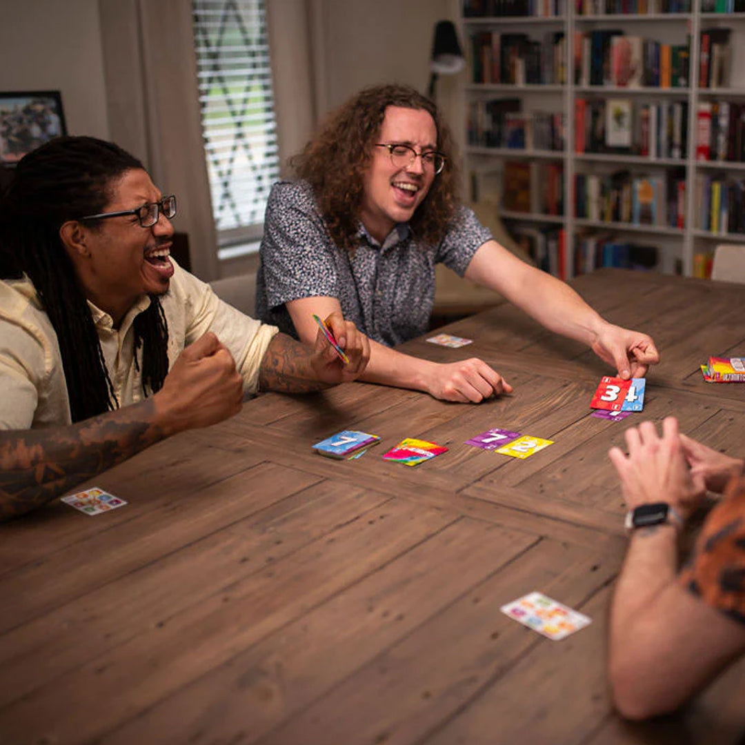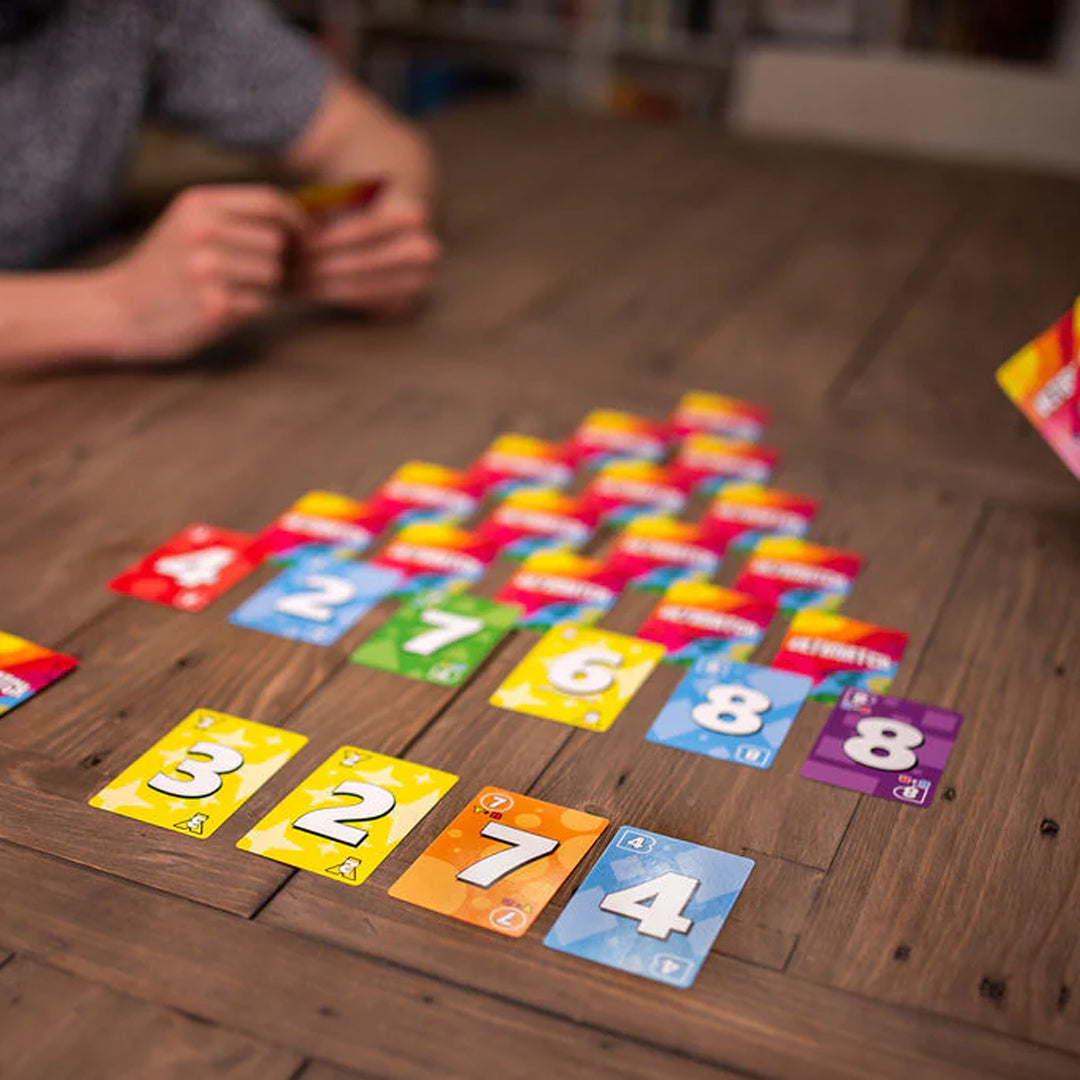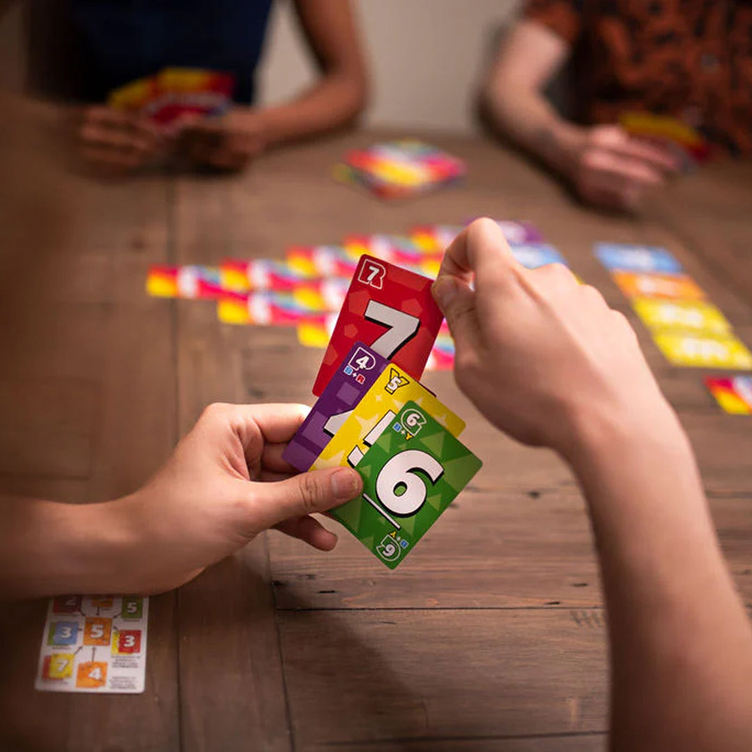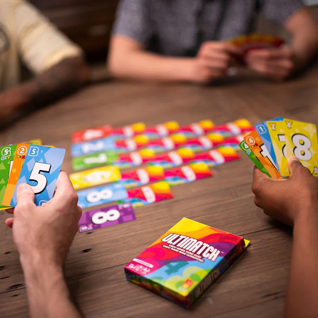 Cooperate to match cards and make your way up the pyramid as a team in this exciting, colorful, addictive game. Make clever matches by number or color. Will you use 1 card or 2? Addition or subtraction? Mix colors (yellow + blue = green)? Will you risk a card now or save it for later? Can you guess what card the other player needs? Make a perfect match of both number and color to feel the thrill and gain the rewards of an Ultimatch!